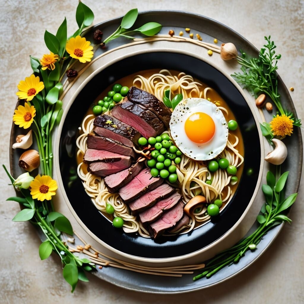 Wie goldene Felder im Nebel, entfaltet sich das Aroma von zart gebratenem Rindsentrecôte, sanft gewendet in Gänseschmalz und von Tamarindenkuss, Estragon und Saflorblüten begleitet. Rundherum tanzen Pilze, Lauch und Zwiebeln im Kalbsfond, während frische Kefen wie Morgentau dazu leuchten. Gebratene Eiernudeln saugen den Duft von Butter, Erdnuss-Öl, Sojasauce und der sämigen Tamarindenextrakt-Sauce ein – ein Kranz aus Herbstfarben, Kräuterpoesie und zartem Umami.