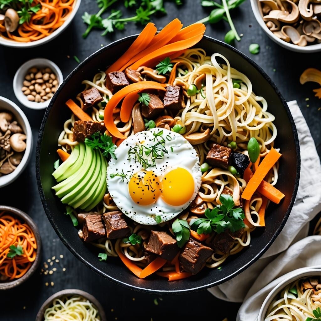 Drei Klangfarben, frei und doch harmonisch vereint: Würzige Rindswürfel im goldenen Gänseschmalz tanzen mit Chili, Paprika und cremigem Saucenfond, bevor sie im Joghurtnebel und einem Regen zarter Sprossen zur finalen Melodie finden. Nebenan glänzen Pilze, Lauch und Zwiebeln im Duft von Saflor, Estragon und Erdnussöl wie feuchte Waldblätter nach dem Regen. Im dritten Akt verschlingen sich goldene Eiernudeln, die zwischen Fenchel, Sellerie, Karotten und orientalischen Gewürzen mit schaumigem Ei zu leuchtenden Bändern gebettet werden.