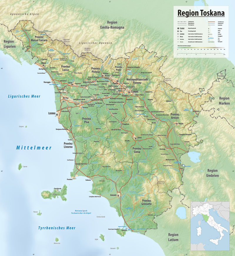 Die Toskana (italienisch Toscana, früher Etruria) ist eine Region in Mittelitalien. Sie grenzt im Norden an Ligurien und die Emilia-Romagna, im Osten an die Marken und an Umbrien und im Süden an Latium. Die Toskana gilt als historische Landschaft, bedeutende Kulturlandschaft und Kernland der Renaissance. Die mittelalterliche romanische Volkssprache der Toskana bzw. der Stadt Florenz, welche auch in den toskanischen Dialekten weiterlebt, ist eine wesentliche Wurzel der italienischen Standardsprache. Die Region ist landwirtschaftlich geprägt, hat allerdings auch mehrere städtische Zentren, die von Industrie, Handel und Dienstleistung, aber wegen ihrer geschichtlichen und kulturellen Bedeutung seit Jahrzehnten auch von Tourismus geprägt sind. Der Name leitet sich von dem in der Antike dort ansässigen Volk der Etrusker ab, diese wurden von den Alten Römern auch Tusci genannt.