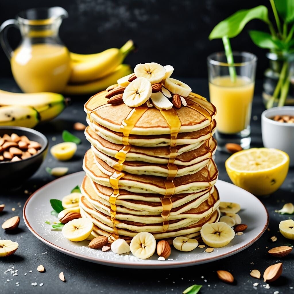 Rühre den Teig so, dass er glatt, aber nicht überarbeitet wird, und gib den Pfannkuchen Zeit, in Ruhe Farbe zu nehmen. Den Duft von Zitronengras, Banane und Rosenwasser nimm bewusst wahr, bevor du das erste Mal wendest.