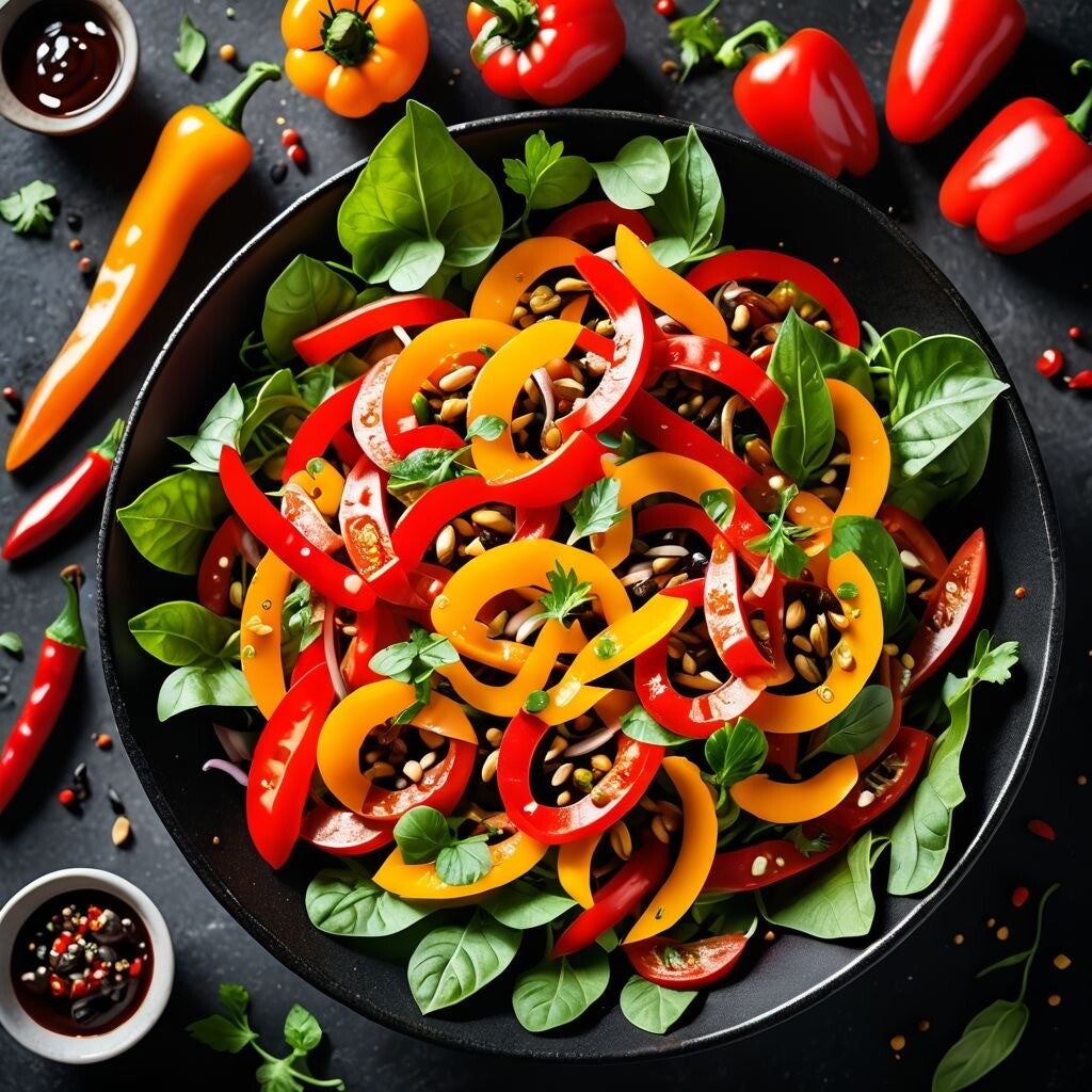 Ein Salat wie ein Frühsommertag: Paprikastreifen tanzen neben roten Tomatenscheiben, der Duft ist frisch und würzig. Die Sauce mischt nussige Wärme mit der exotischen Fruchtigkeit der Tamarinde, Estragon und Saflorblüten streuen blühende Aromen darüber. Dunkler Balsamico und süße Sojasauce umhüllen alles mit einem Hauch von Eleganz und feiner Tiefe, Chili verleiht dem Ganzen einen feurigen Schlussakkord. So schmeckt Leichtigkeit als Parade aus Garten und Gewürz.