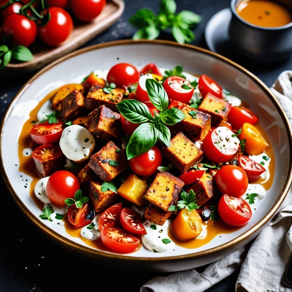 Wie ein Ruf aus Feuer und Erde entfalten sich in diesem Gericht Tiefe und Leichtigkeit zugleich. Zarte Rindsentrecôte-Würfel, in goldenem Mandelöl und fernöstlicher Würze gebettet, treffen auf die Süße reifer San-Marzano-Tomaten. Chili haucht Wärme, während Kalbsfond und Sojasauce leise Umami-Töne setzen. Darüber ruht ein Schleier aus griechischem Joghurt, der sich mit Keimlingen zu einem erdigen, frischen Akkord verbindet – gekrönt von gerösteten Mandeln, die den Duft der Sonne tragen. Ein Gericht, das leuchtet, klingt und duftet – warm, würzig und elegant in seiner Balance aus Kraft und Zartheit.
