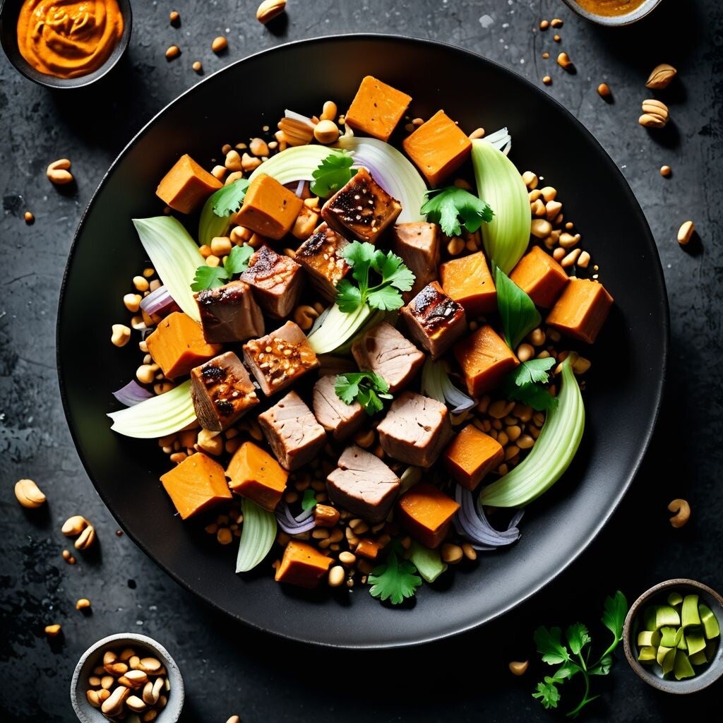 In Erdnussöl und süsser Sojasauce marinierte Schweinsfiletwürfel auf Schwarzkümmel-Süßkartoffelcrème mit Lauch, Zwiebeln, Koriander und gerösteten Erdnüssen.
