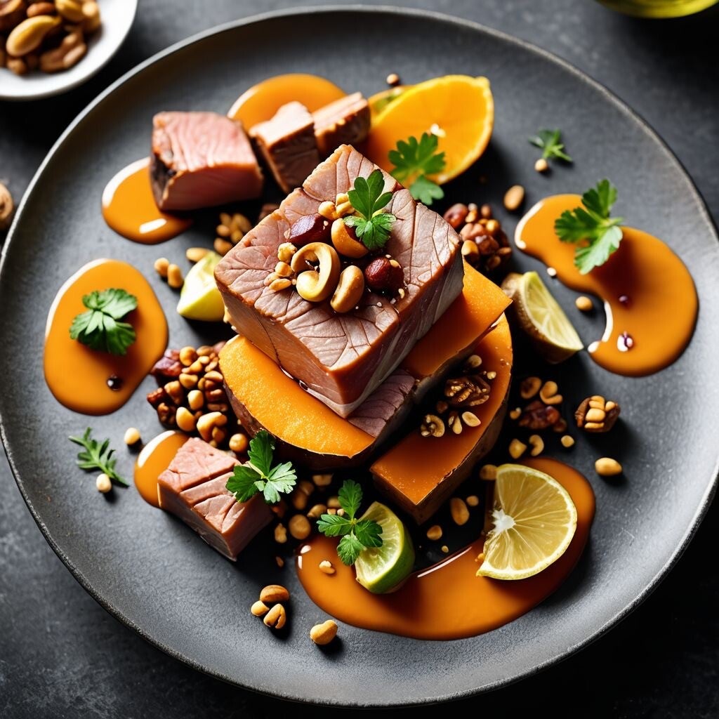 Sie ruhen auf einem samtigen Bett aus Süsskartoffel-Tamarinden-Püree, in dem Süsse und Säure ein leises Gespräch führen, bevor knusprige Erdnüsse und frische Zitrusnoten dem Ganzen einen heiteren, fast spielerischen Schlusspunkt setzen.